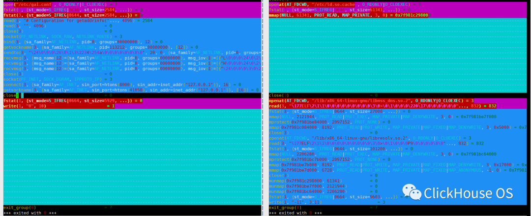 分别strace这两个binary的运行过程,左右分别对应u16和u20编译的bianry。可以看到右边会多加载很多.so文件,而这些.so文件并不能通过copylib工具打包。个人猜想这个原因导致了test_getaddrinfo运行时没有彻底去除对u20内核的依赖,进而导致::getaddrinfo