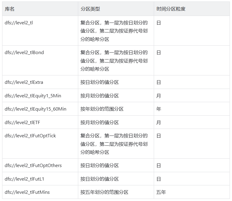 // 导入模块use ImportTLData::loadTLEntrust// 定义数据导入函数def loadEntrustStock(startDate, endDate, loadType){// 设定参数, 需根据实际情况改动userName = "admin"password = "123456"dbname = "dfs://level2_tl"tableName = "entrust"filePath = "/hdd/hdd3/customer/tlData/"// 增量导入if(loadType == "daily"){idate = today()infoTb = loadTLEntrustStock(userName, password, idate, idate, dbname, tableName, filePath, loadType)}// 批量导入else if (loadType == "batch"){infoTb = loadTLEntrustStock(userName, password, date(startDate), date(endDate), dbname, tableName, filePath, loadType)}return infoTb}