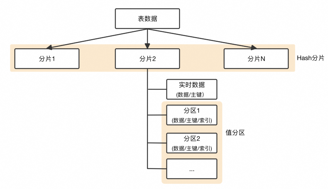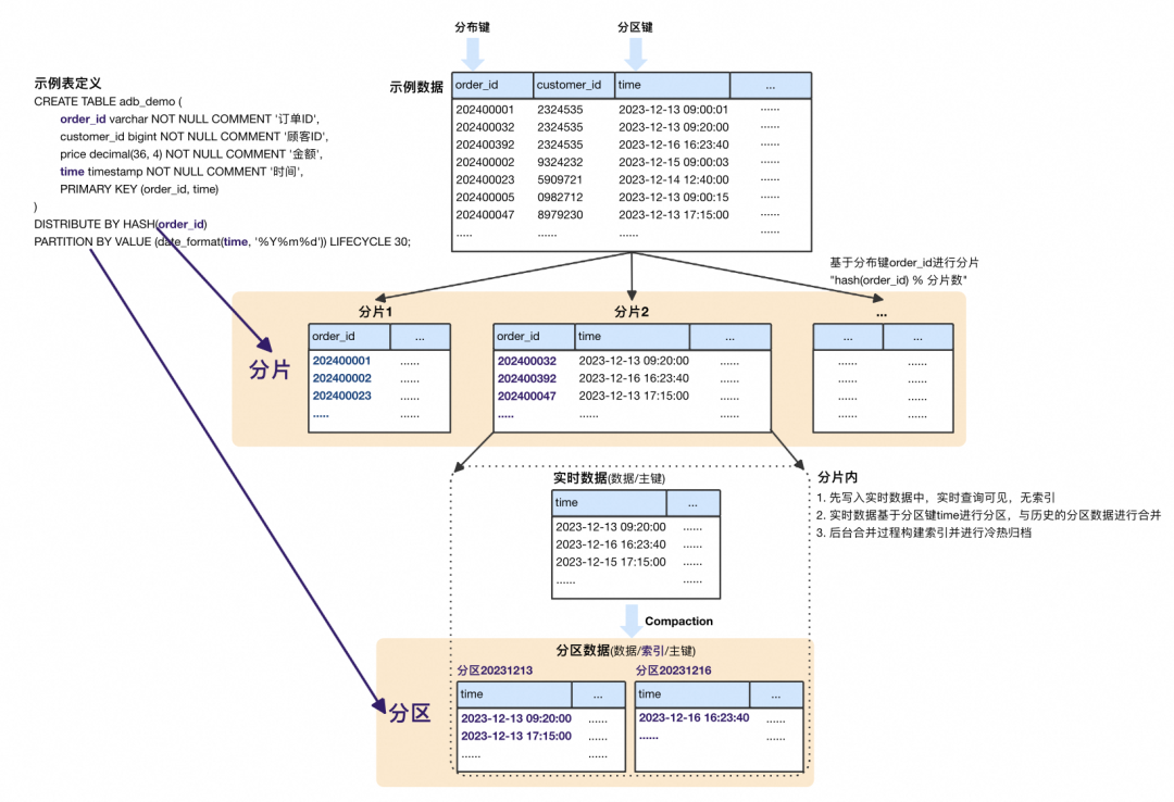 表数据首先基于分布键order_id进行分片,将整张表数据打散成N份。分片内部基于分区键time按天进行分区,首先写入到实时数据中对用户查询可见,后台Compaction时与历史分区进行合并,构建索引并以分区为粒度做冷热归档。模型示意如下: