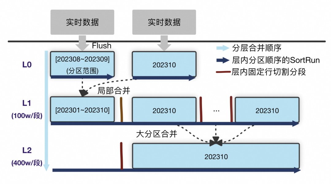L0。来自实时数据的Flush产生物理文件,物理文件内按用户定义逻辑分区有序组织。因此L0的每一个物理文件都是按分区顺序的SortRun; L1及以下层。来自上层的局部合并,整层是一个逻辑SortRun,按分区有序。SortRun按固定行切割为物理文件进行组织,层级间大小相差一个系数。