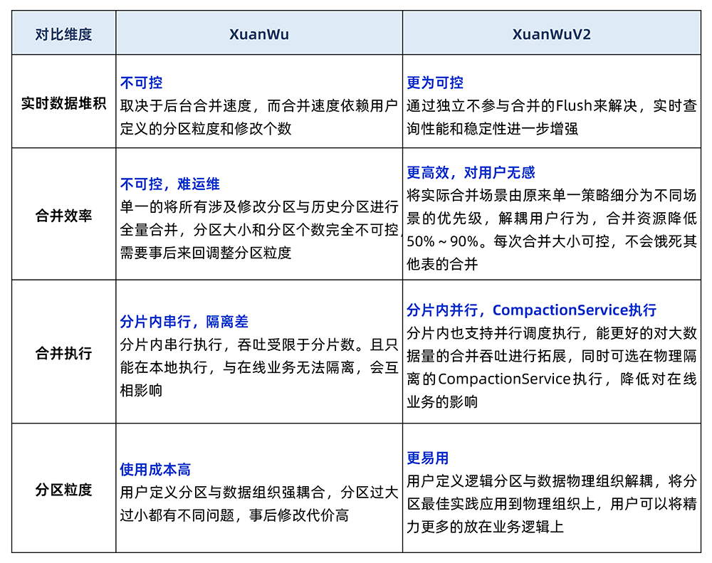 实时数据堆积。分片内实时数据在合并到分区前没有索引,而合并由于数据组织的原因只能串行。当写入速度大于后台合并速度时实时数据会积压,会导致典型查询慢问题。 分区粒度不可控。分片内的每次合并,都要将实时中涉及到的历史分区全量合并,产成新的分区数据。在分区由用户定义的前提下,定义分区很小时,会导致大量小文件,而定义分区很大时,合并开销又大大增加,进一步导致实时数据堆积问题。这些都只能事后运维干预,开销极大。