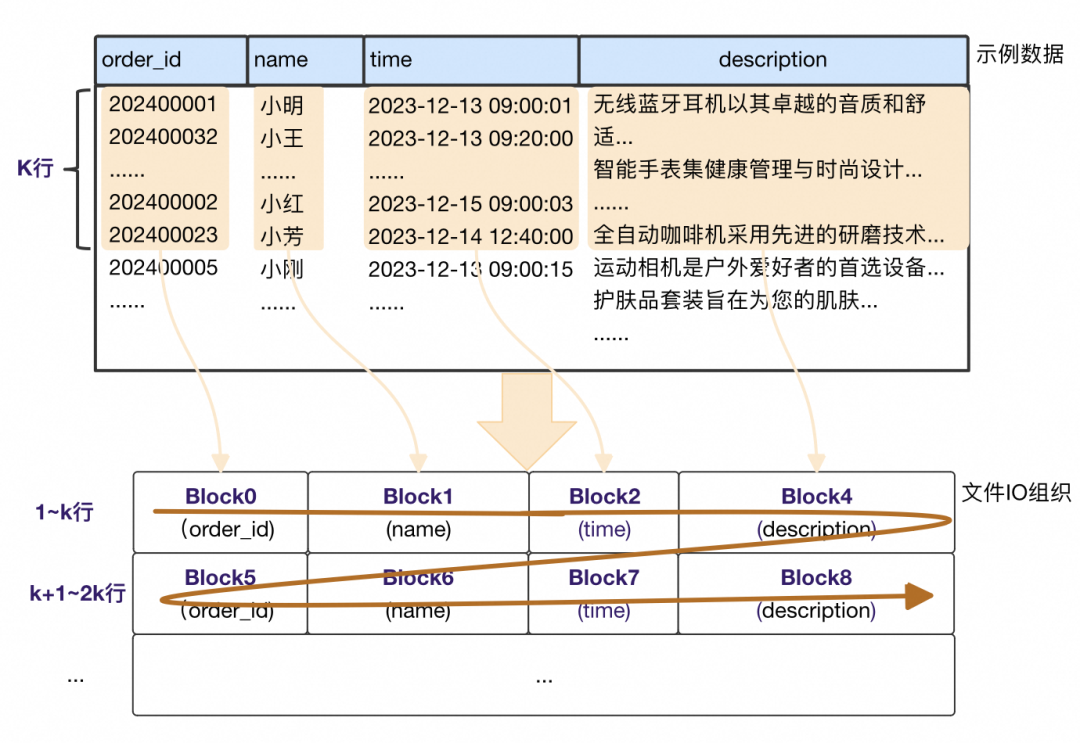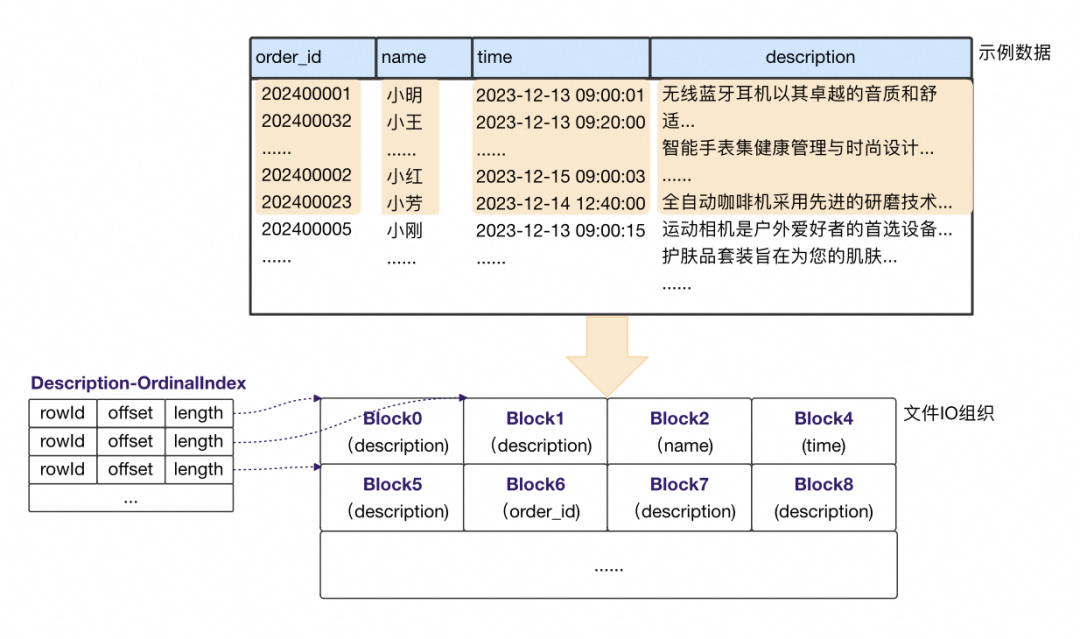 不同列IO块大小(压缩前)是固定的。对比固定行IO组织下,description列由于单条记录过大,单IO块比其他列大的多。 多了额外的辅助结构OrdinalIndex。同样IO大小下,不同列能容纳的行数是不一样的,基于行号去随机寻址IO块需要辅助结构,记录每个IO块的开始rowId和IO块信息,如上Description列的OrdinalIndex每条记录对应每个Block的信息。