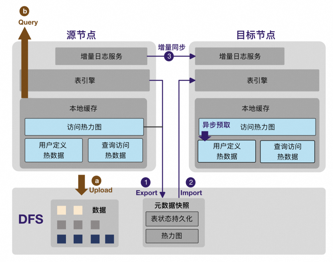 源节点Export出去表在DFS上快照版本信息,作为恢复元数据。同时Export源节点访问热力图; 目标节点Import快照版本信息,恢复表引擎状态。同时Import热力图启动高频访问数据的异步加载; 源节点从快照位点开始增量同步到目标节点,追齐后切换提供查询。