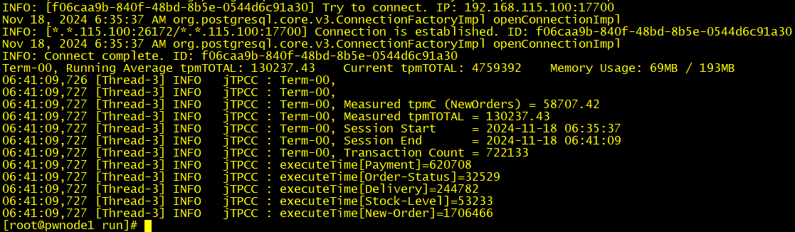 # 数据库类型,postgres代表对PG数据库进行测试,支持数据库包括PostgreSQL/EnterpriseDB、DB2、Oracle、SQL Server和MySQL db=postgres # 驱动 driver=org.postgresql.Driver # 修改连接字符串, 包含IP、端口号、数据库名 conn=jdbc:postgresql://192.168.115.100:17700/tpcc?prepareThreshold=1&batchMode=on&fetchsize=10&loggerLevel=off # 设置数据库登录用户和密码 user=tpcc password=Panwei@1234 # 仓库数,每个Warehouse的数据量大小约为76823.04KB warehouses=20 # 用于在数据库中初始化数据的加载进程数量,默认为4 (建议填写CPU核数) loadWorkers=4 # 终端数,即:并发客户端数量, 跟服务端最大work数对应,通常设置为CPU线程总数的2~6倍 terminals=8 # 每个终端(terminal)运行的固定事务数量,当该参数为非0时,runMins参数必须等于零 runTxnsPerTerminal=0 # 要运行指定的分钟,当该参数为非0时,runTxnsPerTerminal必须等于零 runMins=5 # 每分钟总事务数 limitTxnsPerMin=0 # 在4.x兼容模式下运行时,设置为True。设置为false以均匀使用整个配置的数据库。 terminalWarehouseFixed=false # 以下五个值相加之和为100 (45、43、4、4和4的默认百分比与TPC-C规范匹配) # newOrderWeight=45 新订单事务占总事务的45% # paymentWeight=43 支付订单事务占总事务的43% # orderStatusWeight=4 订单状态事务占总事务的4% # deliveryWeight=4 到货日期事务占总事务的4% # stockLevelWeight=4 查看现存货品的事务占总事务的4% newOrderWeight=45 paymentWeight=43 orderStatusWeight=4 deliveryWeight=4 stockLevelWeight=4 # 测试数据生成目录,默认无需修改,默认生成在run目录下面,名字形如my_result_xxxx的文件夹 resultDirectory=my_result_%tY-%tm-%td_%tH%tM%tS # 操作系统性能收集脚本,默认无需修改,需要操作系统具备有python2环境 osCollectorScript=./misc/os_collector_linux.py # 操作系统收集操作间隔,默认为1秒 osCollectorInterval=1 # 操作系统收集所对应的主机,如果对本机数据库进行测试,该参数保持注销即可,如果要对远程服务器进行测试,请填写用户名和主机名 //osCollectorSSHAddr=omm@192.168.0.11 # 操作系统中被收集服务器的网卡名称和磁盘名称 osCollectorDevices=net_ens33 blk_sda |
