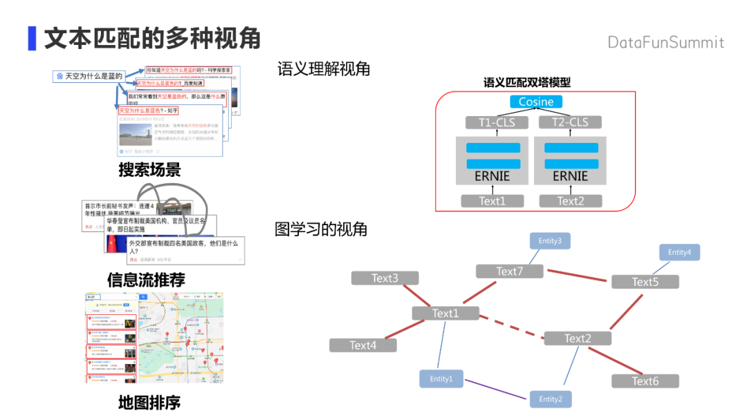 文本语义匹配问题是较常见的语义理解任务,也是在工业界比较常见的一个场景,如搜索,推荐,排序任务上都会涉及相关的技术。文本匹配有多种视角。第一种视角是语义理解视角,从纯文本的角度去理解。常用的方法如用语义匹配的双塔模型直接对一个文本进行建模,然后去评估两个文本的相似度;第二种视角是图学习视角。与学术场景不同的是,工业界搜索引擎和推荐系统具有丰富的知识,如在推荐系统中的点击序列,搜索的点击与文章标题的关系,文章百科类知识等都有丰富的非结构化信息。常见的文本可以通过图的方式来连接起来。如果所有的文本都可以通过某种方式来组织成一张文本图网络的话,文本匹配在图视角来看就变成链接的预测问题。