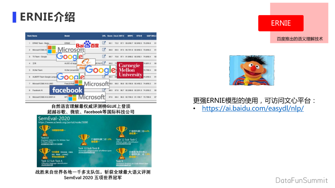 因为在预训练模型上的突破使得ERNIE模型在多个语义理解任务上取得较大受益,ERNIE模型为GLUE榜单上的第一名,斩获SemEval2020五项世界冠军。