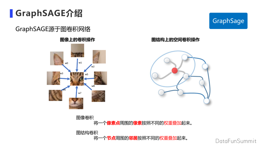简单介绍下图结构方面的建模, GraphSAGE是比较常见的图神经网络。简单阐述下图网络思想,图神经网络可以简单类比在图象上的卷积操作。例如在图像上做3*3的卷积,相当于对一个像素周围的像素点,通过不同的权重叠加,然后以聚合后的小图片代表小范围的图片表示。图的卷积上,数据没那么规整,因为每个节点的邻居数量是不同的。我们可以用类似的概念,只是不像图像每个方向的权重是不同的,而是对所有的邻居一视同仁。对邻居通过加权的方法叠加,用周围的邻居代表自身。