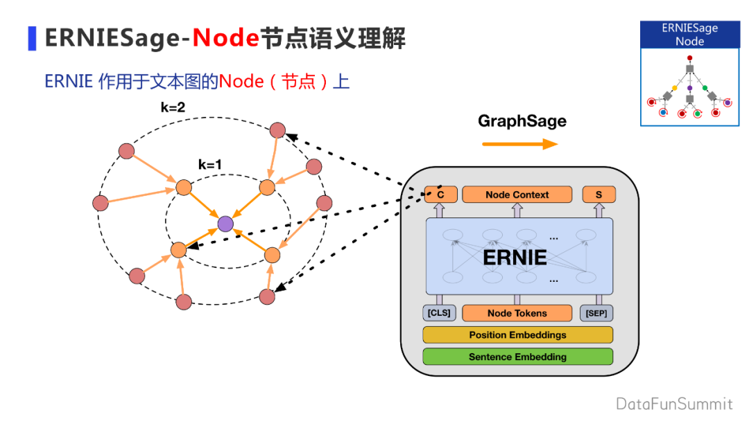 ERNIESage-Node是一种最简单直接了当的方法。在GraphSAGE的最底层接入ERNIE模型,通过图聚合的方法获取节点表示。ERNIE模型会跟随着下游任务进行finetune。