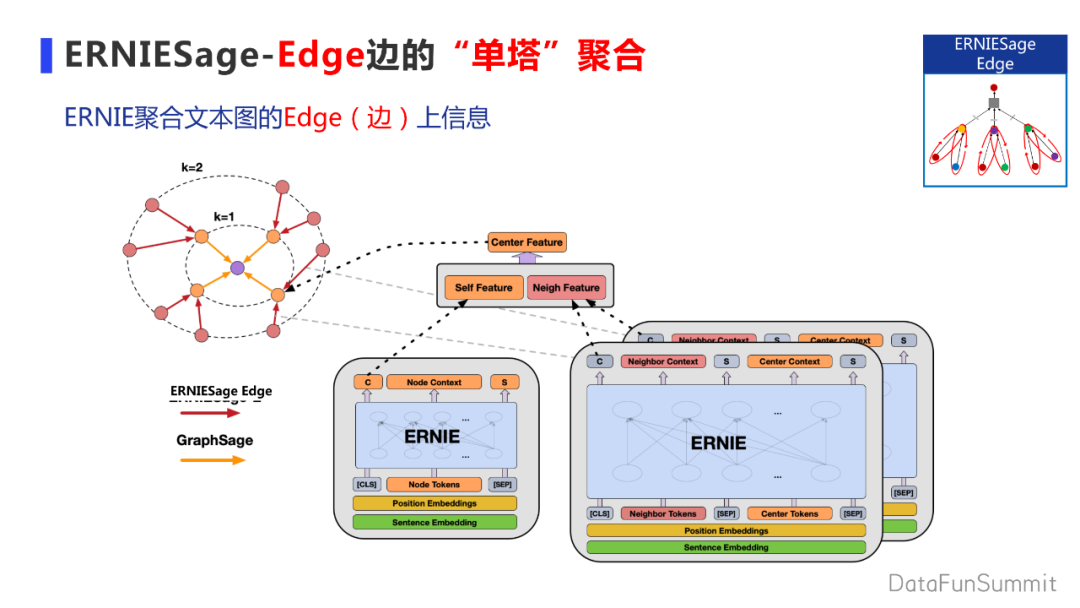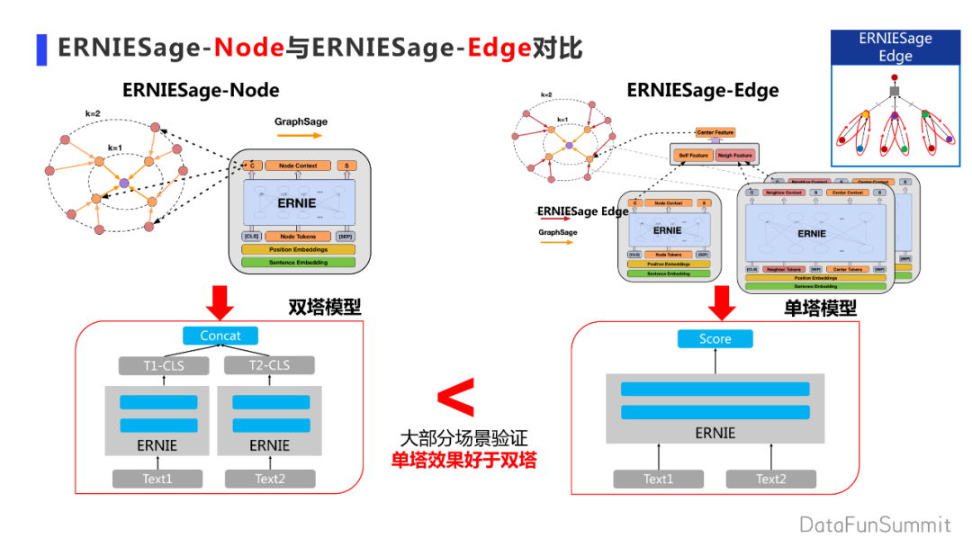 ERNIESage-Edge模型与ERNIRSage-Node模型不同,因为单纯的节点模型建模缺乏了节点与外部知识之间token级别的交互。因此在Edge模型上,把ERNIE模型挪到图的边上去,做token级别的交互获取节点的表示。
