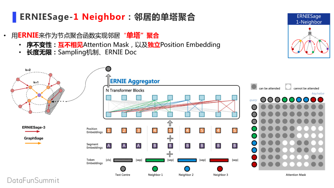 ERNIESage-1 Neighbor进一步扩大单塔的覆盖范围,把一些邻居通过采样的方式拉回来一部分,利用互不相接的Attention Mask以及独立的Position Embedding来保持神经网络聚合函数不变性的要求,将单塔ERNIE模型用在图神经网络的聚合函数上。