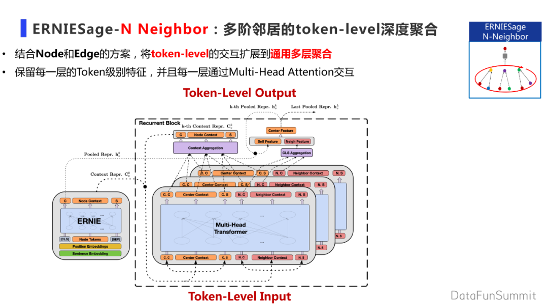 前面三种策略都是作用于一阶邻居。结合node和edge的方案,将token-level的交互扩展到通用多层聚合。首先用ERNIE模型获得context表示,在每一层邻居聚合时,将中心节点的context和邻居进行拼接,通过多头transformer进行中心表示抽取,最终通过聚合的方式,获得中心表示的汇总。每一层重复这样的步骤,就可以做到每一层都有token级别的特征交互。