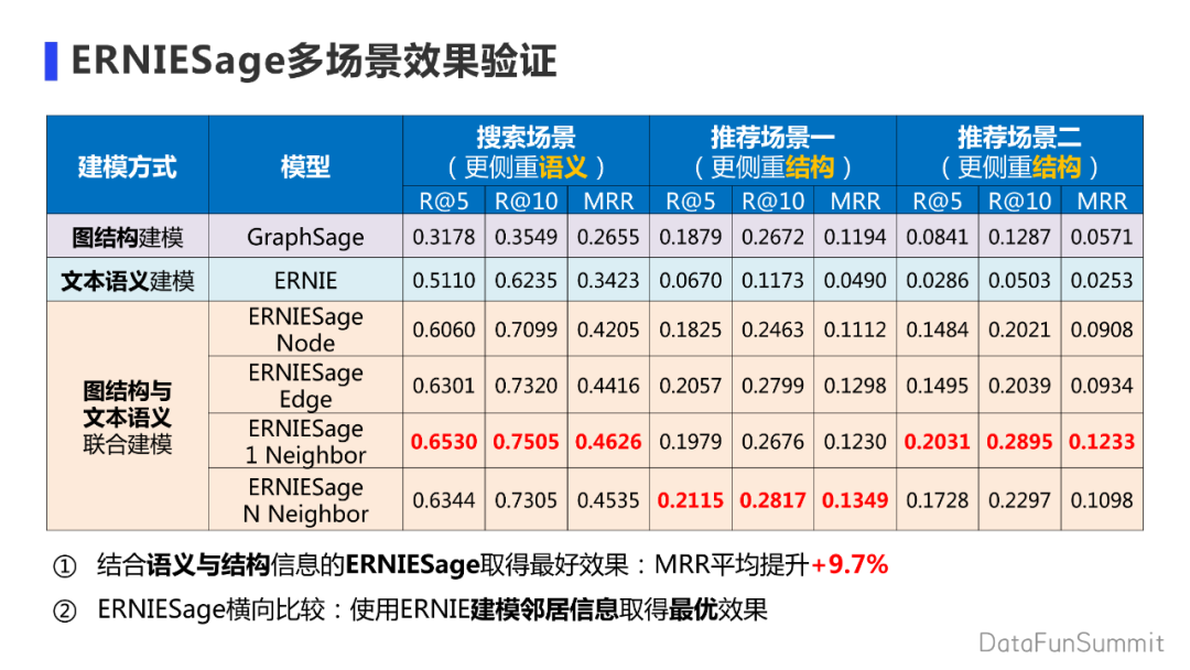 已经在多个场景下验证了ERNIESagede效果,例如在搜索场景上,ERNIESage本身更注重语义,ERNIE模型会优于GraphSage模型。在推荐场景下会更注重结构的信息,所以ERNIE模型效果会略差于GraphSage模型。因此可以通过ERNIESage的方法同时建模结构信息和文本信息,充分保持两种建模的特性,在多个场景上效果挺好。