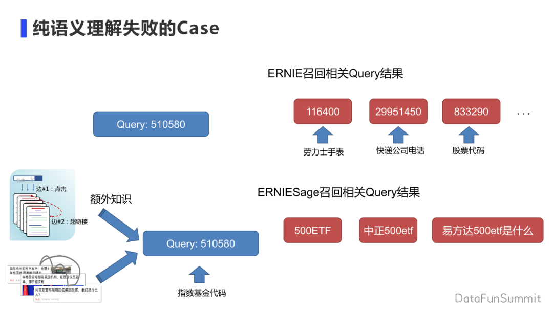 举一个极端的语义理解失败的Case,如碰到一串神秘的数字,在没有额外知识的辅助下,通过ERNIE在下游任务上finetune,做一个语义召回,得到的也是一些神秘序列。当引入额外知识如搜索的点击关系,或者推荐系统的推荐关系。再用ERNIESage在文本图上建模,就会获得额外的知识。纯语义理解的ERNIE在通用场景下更像学习模型的先验知识。当有后验知识后,在做模型的匹配上会更加精确。