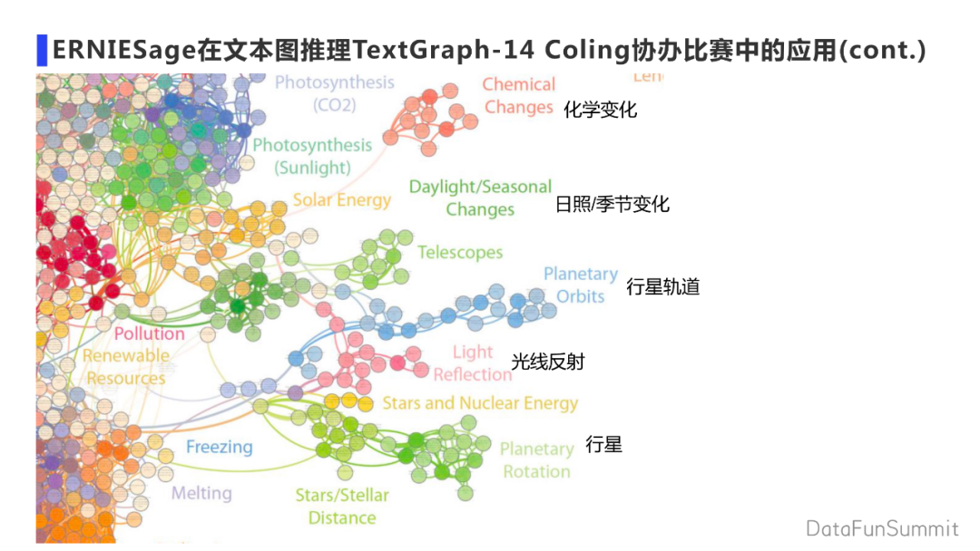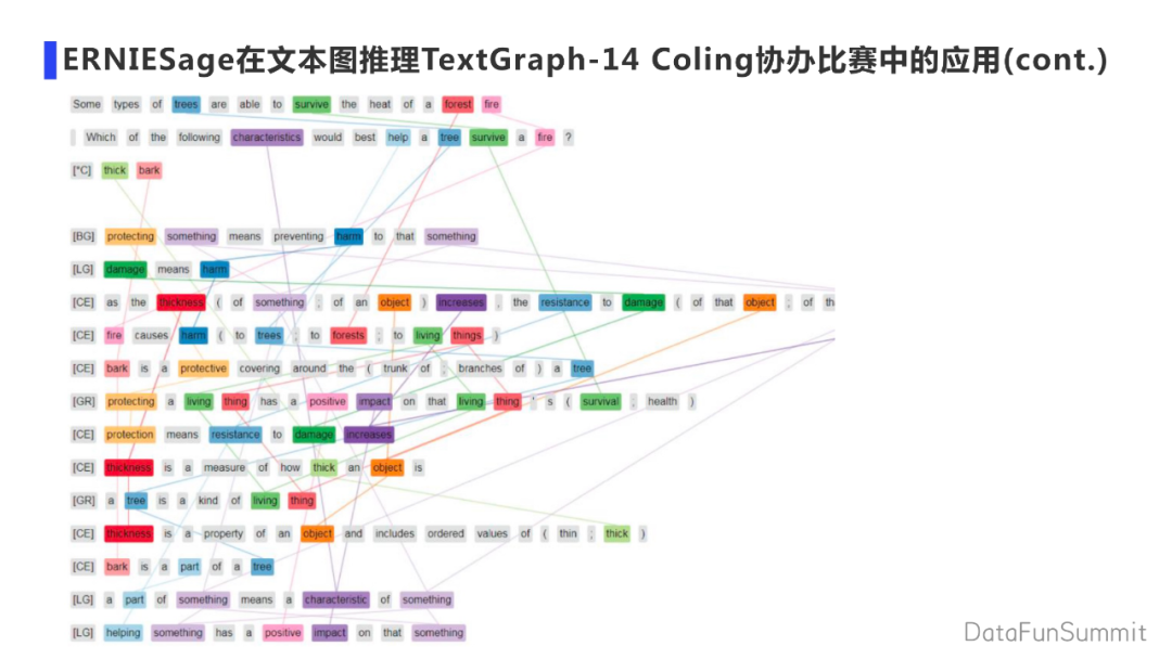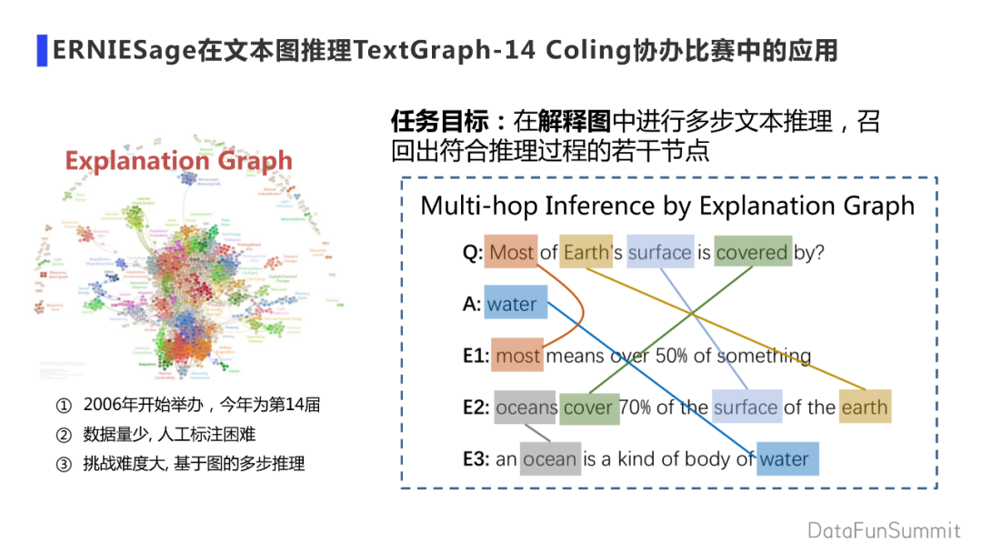 在处理文本图方面,把ERNIESage应用到了TextGraph的多步推理的比赛中。2020年比赛举办到第14届,TextGraph的任务是给出一个问题和答案,需要找出和答案相关的解释,解释是固定的一个库。