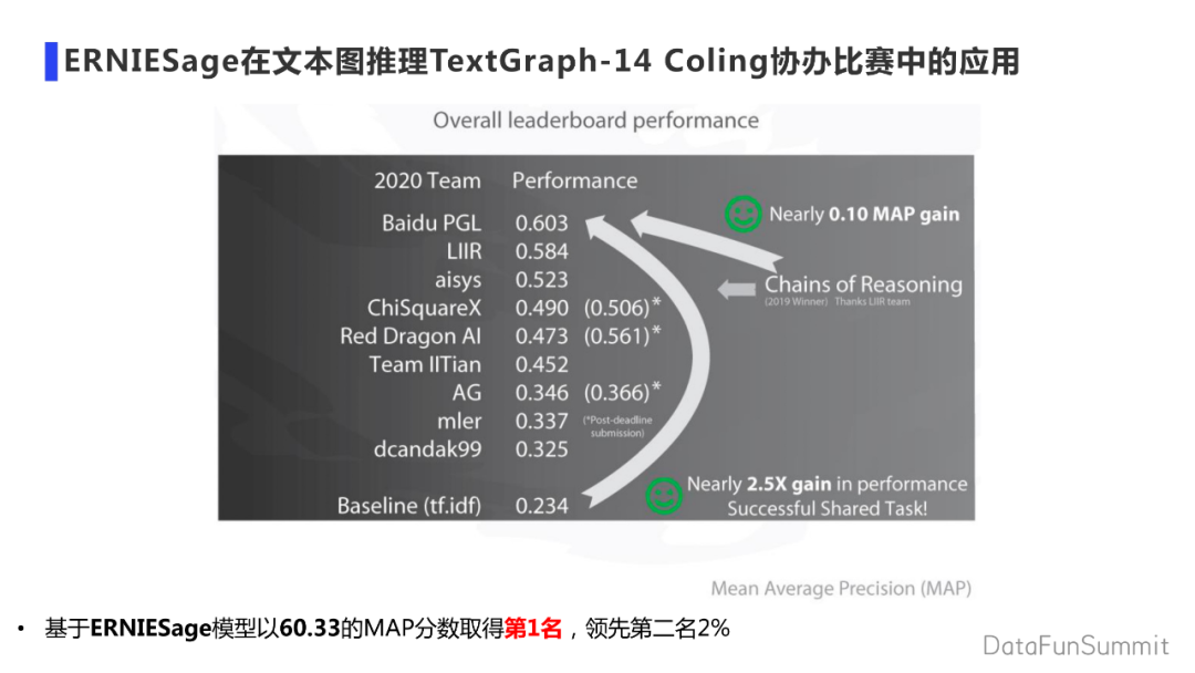 百度将ERNIESage应用到TextGraph比赛中,做问题答案解释的打分,最终取得第一名,领先第二名2%。