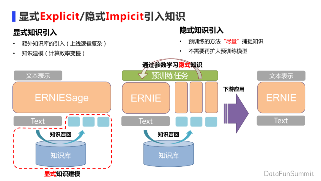 ERNIESage模型将知识作为文本外挂的邻居关系,通过显式的方法作用到节点表示上。显式引入知识就是在文本理解上通过外部知识库做知识召回,再通过更复杂的语义模型对文本进行建模获得文本表示。所以上线时,首先涉及额外知识库的引入,上线逻辑更复杂;其次知识建模模块更复杂,计算效率变慢。