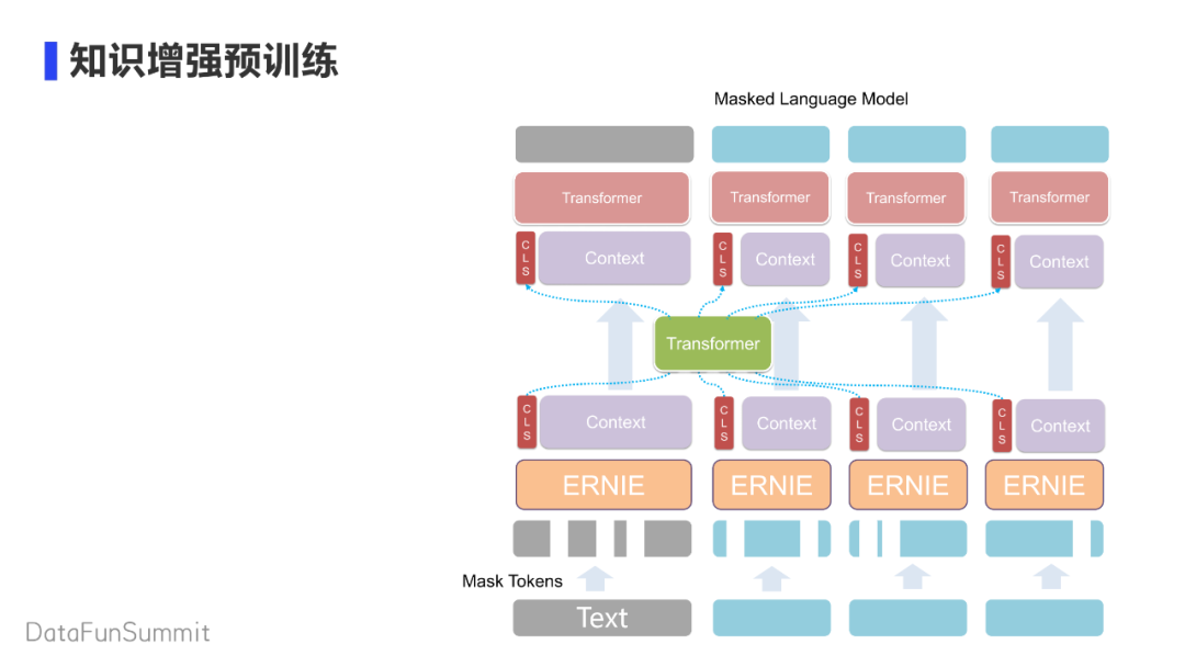 A:如果token不mask直接通过transfomer上去,context信息本身没有缺失。做预测时最上面的language model 会集中用自己本身的信息decode回自己的token。如果在底层上对文本进行mask的话,信息会缺失,会通过CLS和transfomer以及其他外部知识获得知识的补充。上层的CLS和context(局部知识)做信息的还原。因此能够在一定程度上,让transformer做到知识的交互。(详情见“知识增强预训练”页PPT)