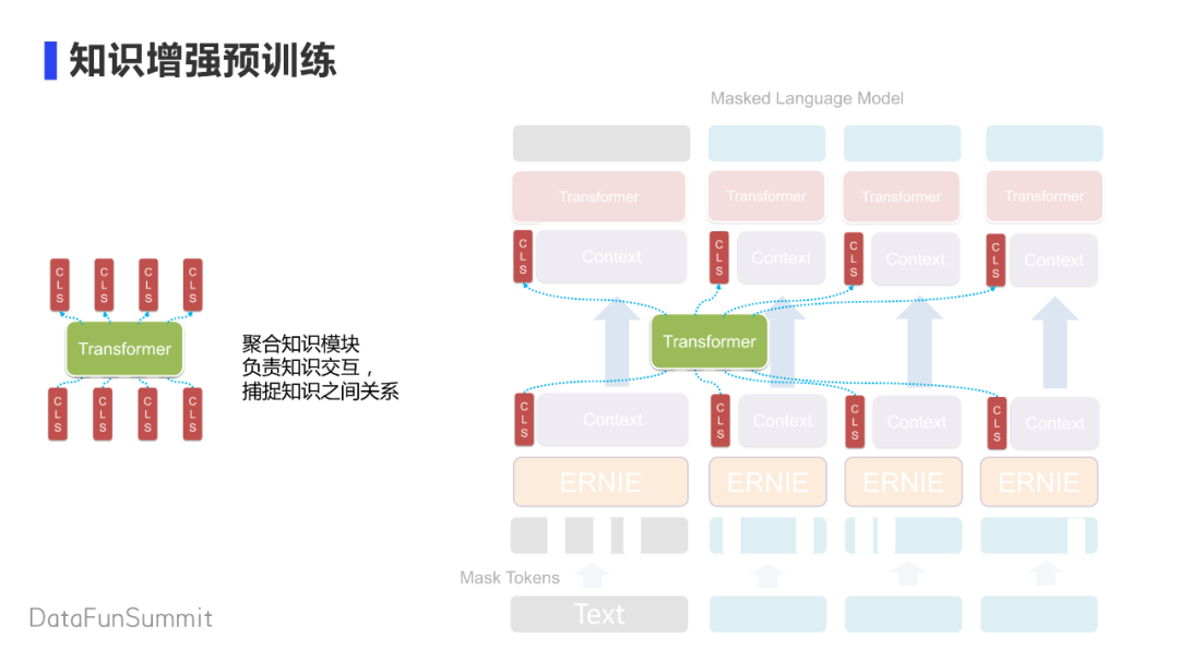 文本照常过预训练模型,获得一个CLS和Context的表示,再拿出CLS通过Transformer模块建模文本和知识之间的交互,参考了Transformer-xh的结构。通过Transformer交互过的CLS又会筛回到文本表示本身去。再通过Transformer根据聚合过的CLS去补充缺失的Context的信息,做语言模型的还原。