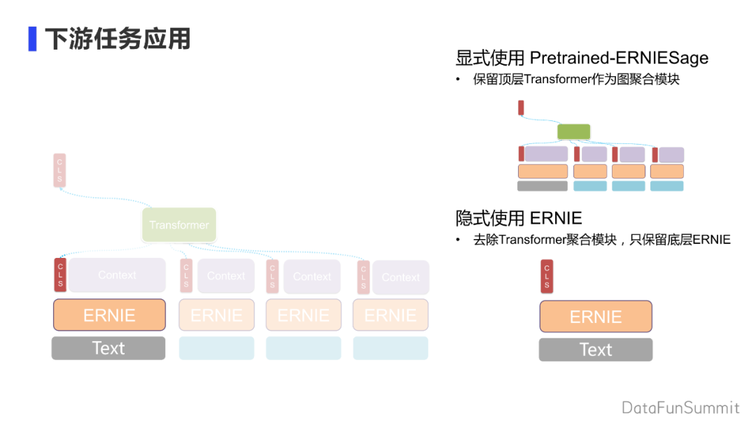 在下游任务的应用中,有很多应用的方式。当保留顶层Transformer的知识聚合模块, 相当于得到了经受过Pretrained的ERNIESage模型。当把聚合模块去除,只选取低层ERNIE来做CLS和文本的表示时会得到一个隐式模型。在计算速度和模型大小上不会有太大变化。