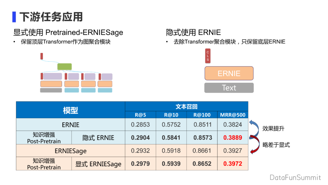 通过知识增强Post-Pretrained的ERNIE模型,经测试尽管拆除一个聚合模块,相较于用ERNIE模型直接finetune效果有较大提升。同时相较于直接使用显示的知识,效果略差。通过post-Pretrained的ERNIESage模型,由于聚合模块本身经过Pretrained,效果会比单纯用ERNIESage略好。
