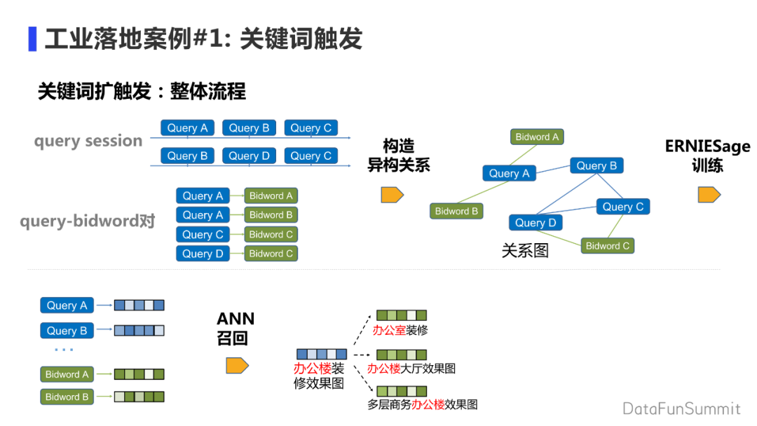 ① 首先来介绍关键词触发,它是根据query的搜索序列,来构造query之间的关系;也会通过query买词构造query买词二步图。在这样的异构关系上进行ERNIESage的训练建模,最终得到query买词的表示。再通过ANN的召回来做query的触发。