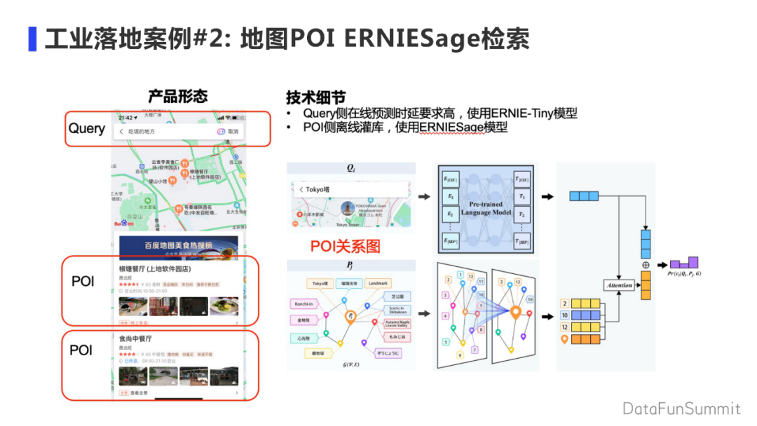 ② 第二个案例是地图兴趣点检索,主要场景是搜索地图时对搜索到的地理位置做相关性排序。由于query侧在线预测时间较高,会使用浅层的ERNIE-Tiny模型进行建模。对于POI来说由于地理位置信息相对稳定,会使用较复杂的模型进行建模,以及离线灌库。对于POI的表示就是通过构造POI的关系,使用ERNIESage来建模POI之间的表示。在线时通过查表的形式,拿到embedding和query进行在线匹配打分。