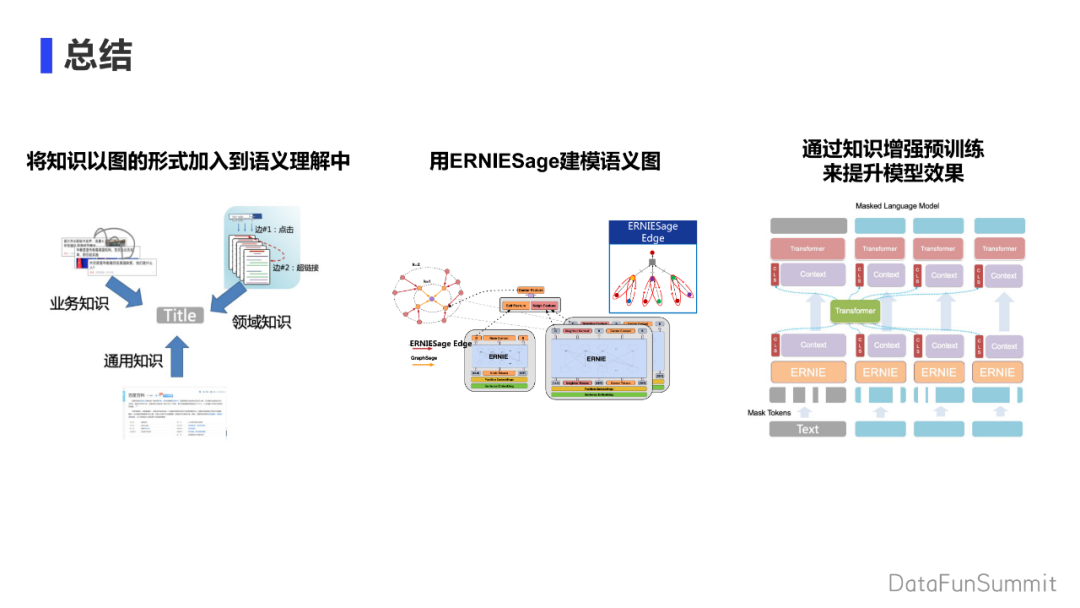 总结:首先将知识以图的形式加到语义理解模块中,利用ERNIESage进行语义图的建模,最后是设计了一些预训练技术,例如在显示的挂载知识时,上线会碰到的一些困难,可以通过预训练的方法解决。有两个产物,第一个产物是显示训练模型效果的提升,第二个产物是隐式模型通过预训练获得知识,在线应用时落地效果好。