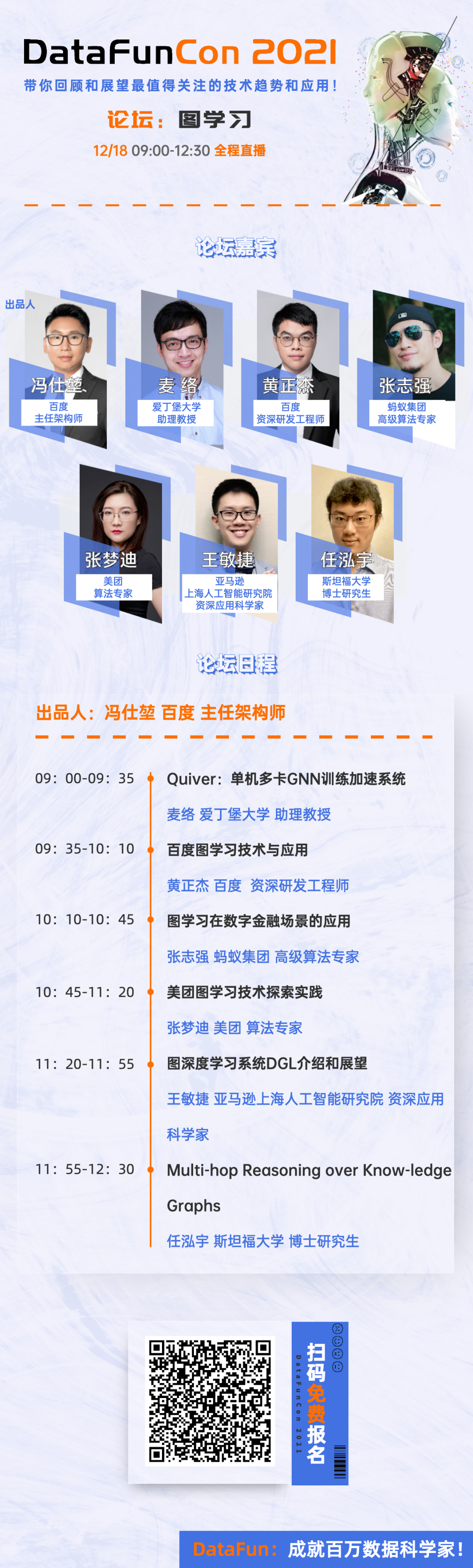 12月18日,在DataFunCon 2021年终大会上,黄正杰老师受邀将在图学习论坛,为大家带来百度图学习的核心技术与最新进展,感兴趣的小伙伴,欢迎识别二维码免费报名收看~