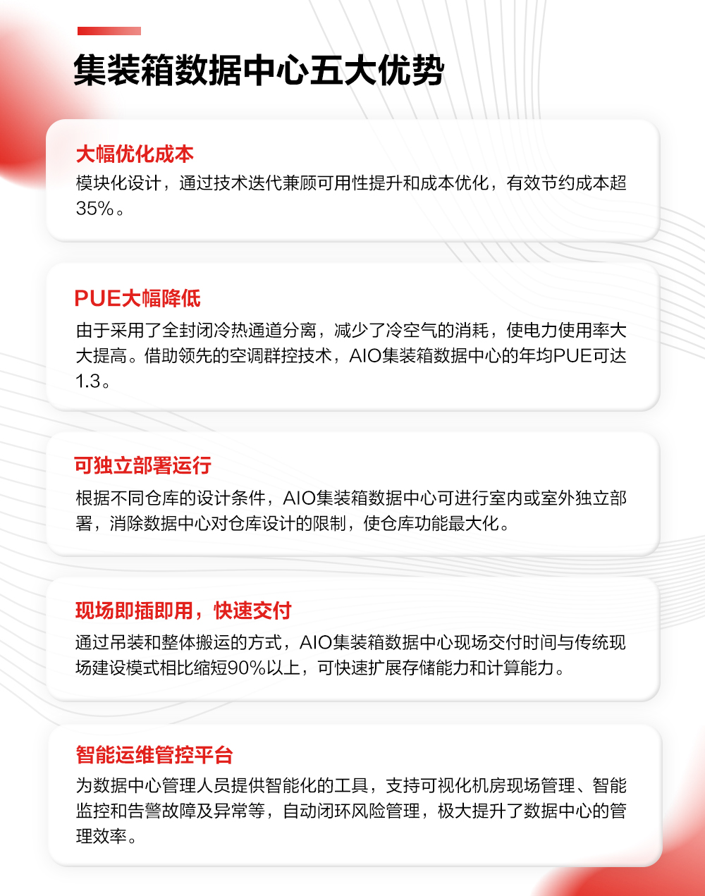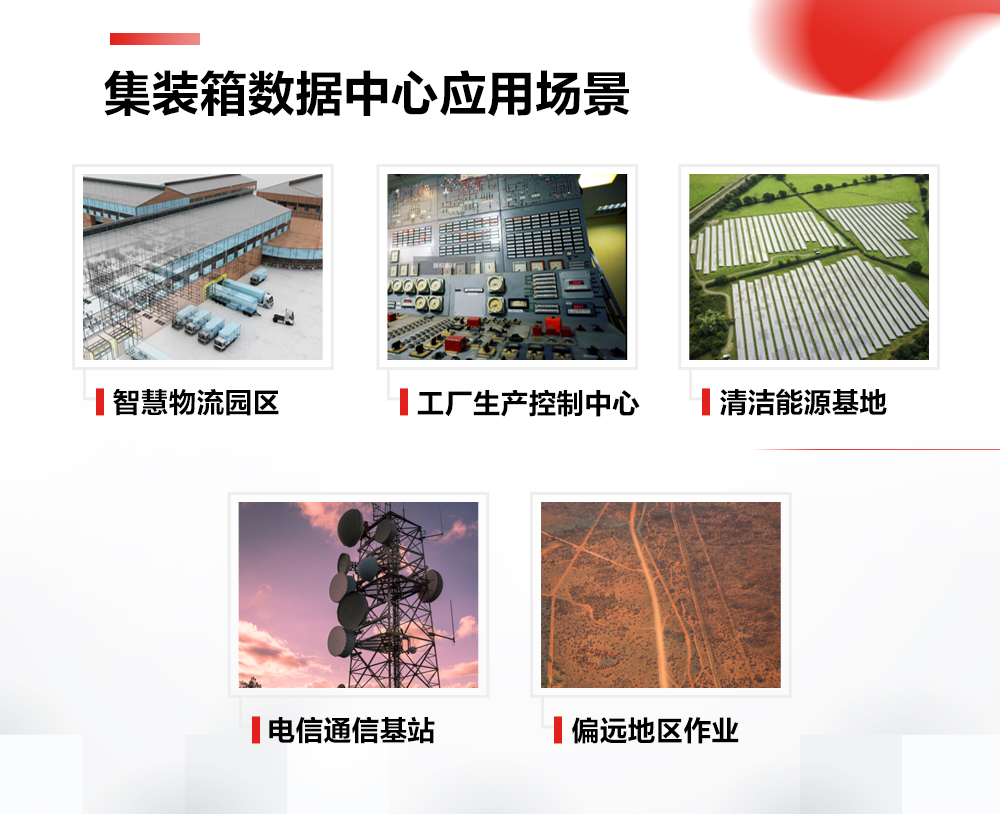 一是一体式集装箱数据中心。一体式集装箱数据中心具备标准化快速交付能力,适用于有整体搬迁需求且提供数据中心运行环境有困难的场景,如物流,能源,制造生产控制中心;电信,广电,科研通信基站;有野外工作需求的数据中心,应急通信或算力保障,有边缘计算需求的场景。