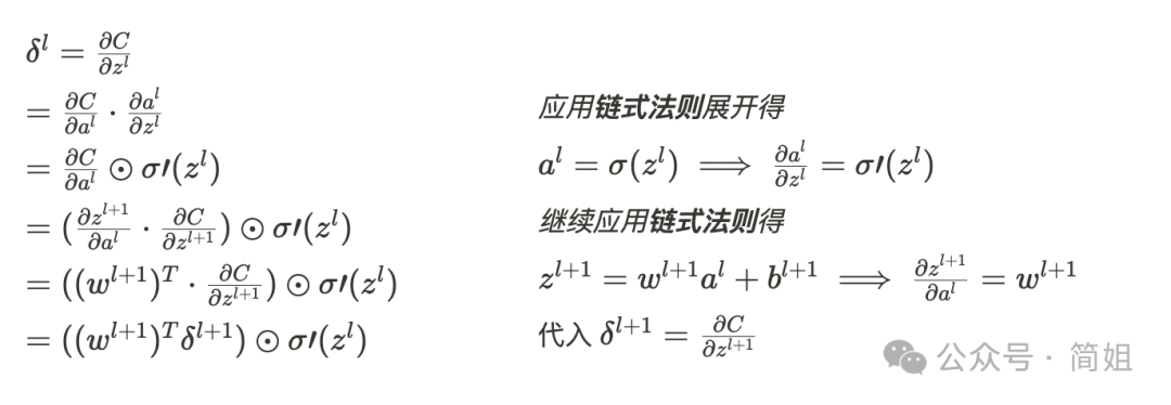 这个公式描述了如何将第 层的误差逐层传递回第 层,是神经网络反向传播算法的核心公式之一。