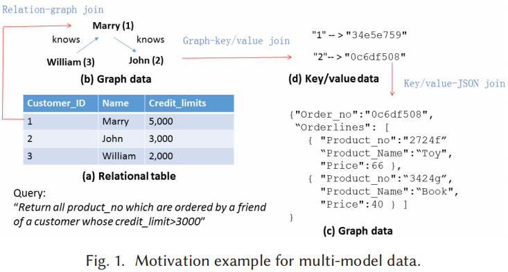 为了更好地展示多模型数据管理的复杂性,该论文提供了一个电子商务场景示例(详见图1)。该示例阐释了如何使用四种不同的数据模型来存储客户信息、社交网络关系、订单详情以及它们之间的键/值对关系。