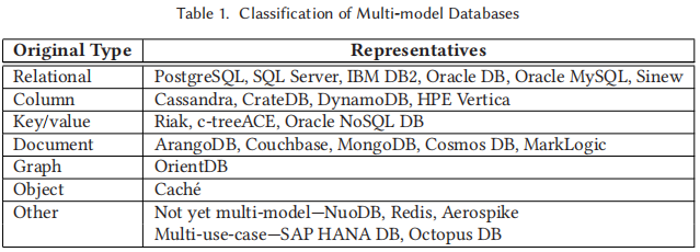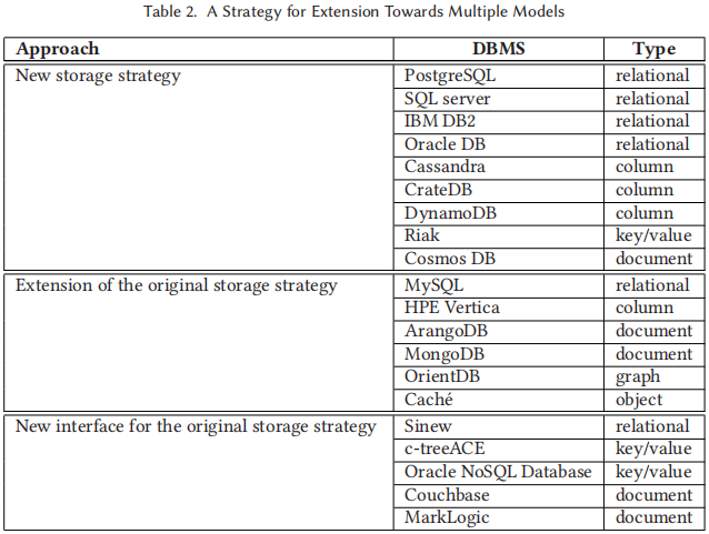 其次,不同于表1的划分标准,作者在表2中根据基于原始模型扩展或基于原始模型的多模组合等不同策略进一步对现有多模数据库系统进行了分类,主要区分了四种不同的类型: