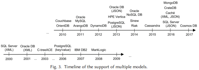 为了让大家对多模数据库系统的发展有一个更加直观的认识,作者在论文中提供了截止论文发表前已有多模数据库的推出时间线,详见图3。这些多模数据库既包含由单模系统扩展至多模系统产品,也包含原生多模数据库产品。
