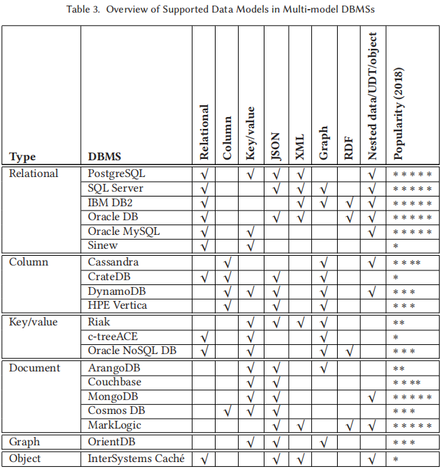 接着,作者在上述分类基础上向大家提供了已有多模型数据库管理系统所支持数据模型的全面概览,详见表3。在这张表中,每个数据库系统根据其支持的数据模型类型进行了标记,反映了不同系统在处理多种数据模型方面的能力。例如,传统关系型数据库 PostgreSQL 和 SQL Server 除了对基础关系模型的支持外,还支持 JSON 和 XML 等半结构化数据模型。此外,该表还在最后一列给出了这些数据库系统的受欢迎程度指标,其统计数据来源于2018年11月 DB-Engines Ranking ,统计依据为不同数据库在技术社区中的讨论频率、网站提及数量等数据指标。