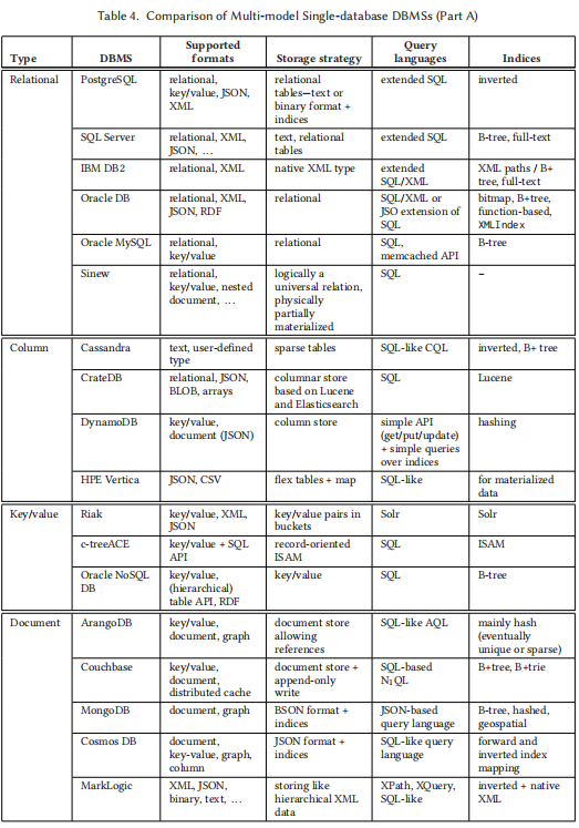 在本章节,作者主要对当前已有多模型数据库系统基于不同的分类标准进行了详细的分类和比较。