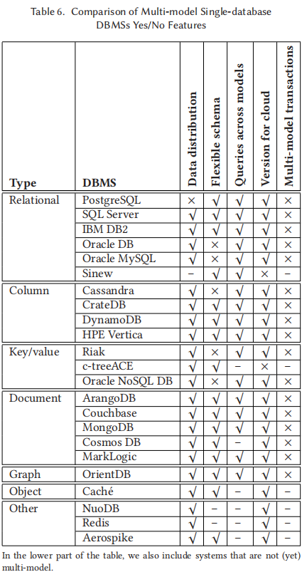 • 跨模型查询(Queries across models):指出数据库是否支持使用单一查询语言跨不同数据模型进行查询。