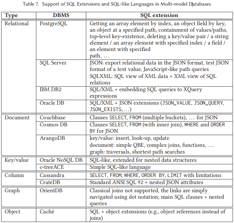表7专注于多模型数据库管理系统中使用的 SQL 扩展和 SQL 类语言的概览,揭示了多模型数据库如何扩展 SQL 以适应多样化的数据查询需求。无论是关系型数据库增强对 JSON 和 XML 的支持,文档型数据库对 JSON 的查询能力,键/值型数据库的 SQL 类语法,列存储型数据库对复杂数据结构的查询,还是图型数据库的点表示法以及对象型数据库的对象引用,都体现了对 SQL 语言的创新性适应,使得开发者能够跨数据模型高效地工作。