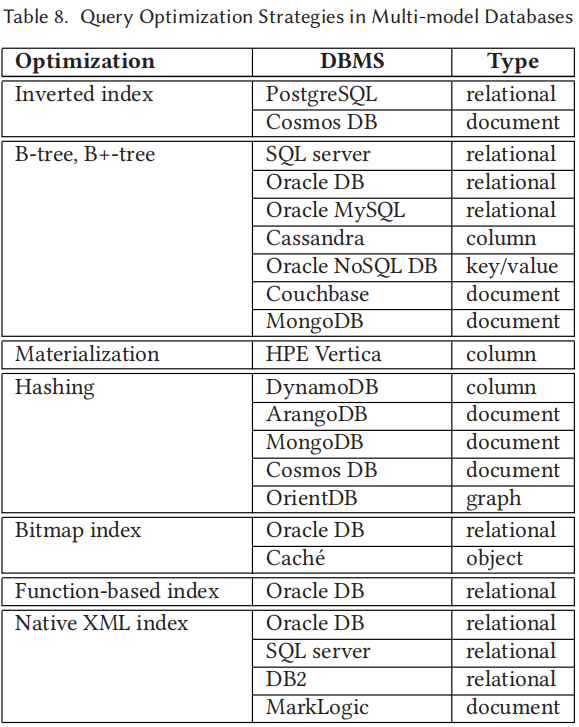 表8概述了不同多模型数据库管理系统(DBMS)在处理非原生支持数据模型时所采用的查询优化技术。最常见的查询优化是 B 树及 B+ 树索引,特别是在关系型数据库中。此外,支持 XML 数据的系统还利用了一种原生 XML 索引,最常见的是基于 ORDPATH 的方法,该方法能够实现高效的查询和数据更新。通过对比,可以看出,目前似乎没有公认的适用于多模型查询优化的最优或次优方法。不同的方法通常与系统向其他数据模型扩展的方式高度相关。