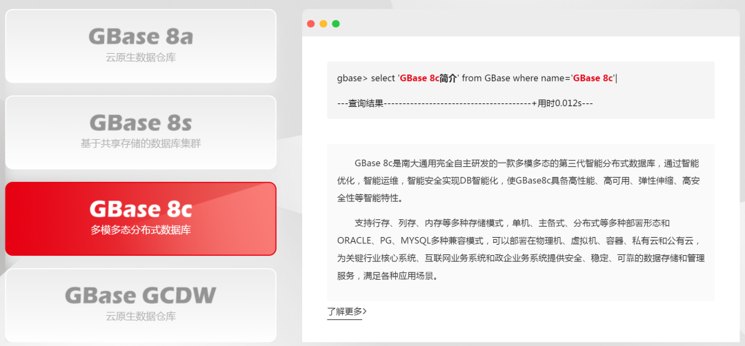 GBase 8a是南大通用代表产品之一,除此以外还有事务型数据库GBase 8c,能够支持集中式、分布式等多个模式,另外还有8s等产品。