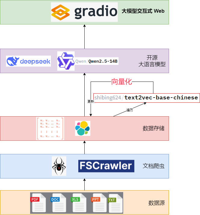 Gradio Web 界面: 位于顶层,使用绿色矩形框表示,标注为“Gradio 大模型交互 Web”。这是用户与系统交互的入口,支持输入查询和接收回答。 Qwen2.5-14b : 第二层,用紫色矩形框表示,包含 Qwen 的标志,以及“Qwen2.5-14B 开源大语言模型”字样。用户查询从 Gradio 传递至此,由 Qwen2.5-14b 处理。 注意咱们用的通义千问2.5的模型,实际也可以换成 DeepSeek 模型。 向量化层: 第三层,用红色矩形框表示,标注为“shibing624/text2vec-base-chinese 向量化”。此层将文本转化为向量,为后续的语义检索提供支持。 Elasticsearch 搜索: 第四层,同样为红色矩形框,包含 Elasticsearch 标志和“搜索引擎”字样。向量化的数据在此存储并用于检索。 FSCrawler 数据摄取: 第五层,用蓝色矩形框表示,标注为“FSCrawler 文档爬虫”,负责将本地文档索引到 Elasticsearch。 数据源: 底层,用米色矩形框表示,包含 PDF、DOC、XLS、PPT、TXT 等文档类型图标,标注为“数据源”。