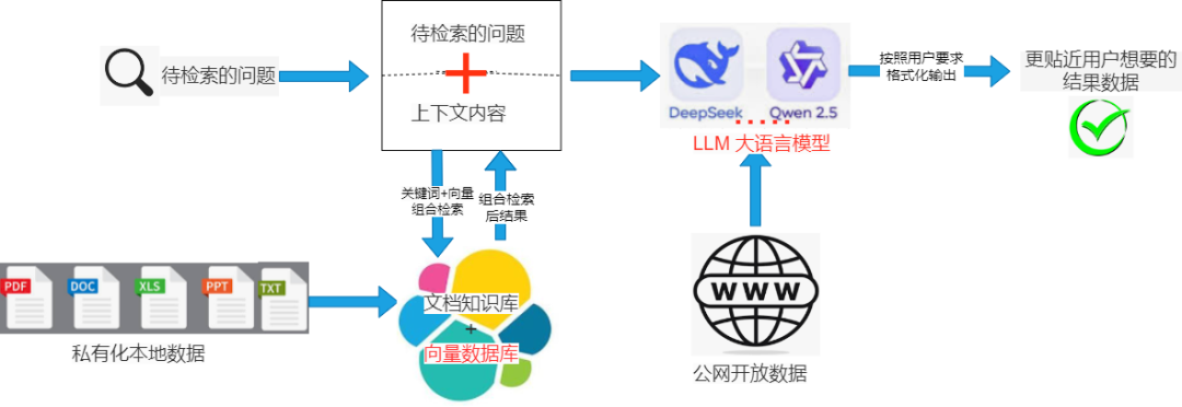输入: 左侧标注为“待检索的问句”,表示用户输入的查询。同时,“私有化本地数据源”(PDF、DOC、XLS 等)作为知识库基础。 Elasticsearch: 中间核心组件,标注为“Elasticsearch”,包含“向量数据库”和“向量检索”模块。查询和数据源均输入此模块,通过向量检索匹配相关文档。 Qwen2.5 LLM: 右侧标注为“DeepSeek ... Qwen2.5 LLM 大语言模型”,接收检索结果并生成回答。 输出与验证: 最终输出为“提取用户想要的精准答案”,并通过“结果验证”确保准确性。此外,系统提供“公网开放接口”,支持 API 访问。