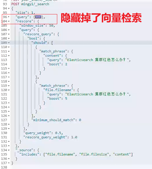 将用户查询向量化并在 Elasticsearch 中执行相似性搜索,这里本质做的是关键词匹配+向量检索的组合方式。