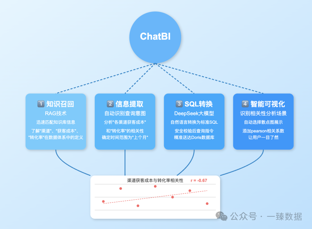 现在,他只需对着ChatBI说:"帮我看看上个月各渠道获客成本与转化率的关系