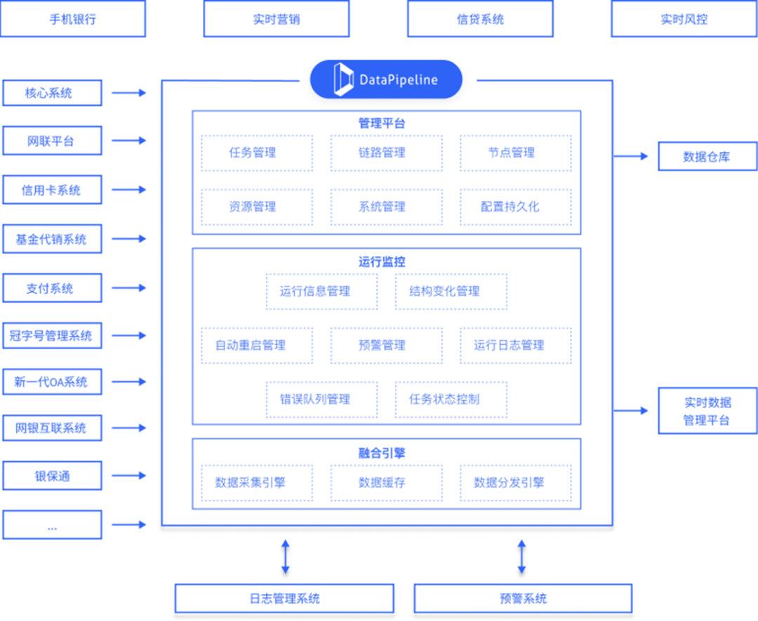 为满足行内发展战略规划和当下金融业务需求,该银行决定搭建一套近实时的业务数据流转平台,并选择了DataPipeline。DataPipeline企业级实时数据融合平台适配了MySQL、星环、Kafka等多种数据库管理技术,并打通了核心系统、网联平台、信用卡系统、基金代销系统、支付系统、冠字号管理系统、新一代OA系统、网银互联系统、银保通等多种业务系统。通过解析日志的方式,平台能够捕捉这些系统中异构数据的实时变化,并将其封装成消息流的形式,供给下游数据仓库与实时数据管理平台。最终,借助数据流计算平台,实现近实时地向各外围系统供数的目的。