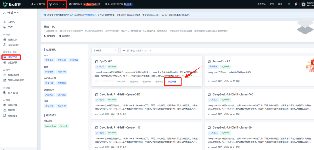 基石智算致力于打造技术领先的 AI Infra 平台,将 AI 算力云与模型开发部署服务完美融合,通过模型广场实现云端一键部署,让用户更便捷地根据自身需求进行个性化的模型调用和管理,按需使用算力。