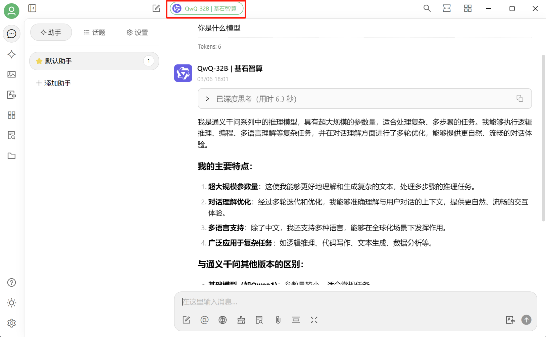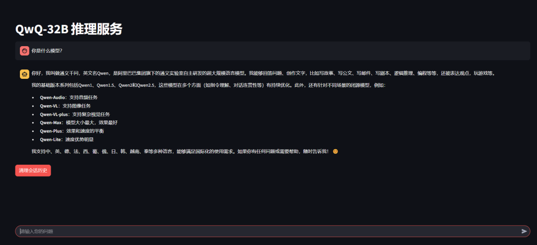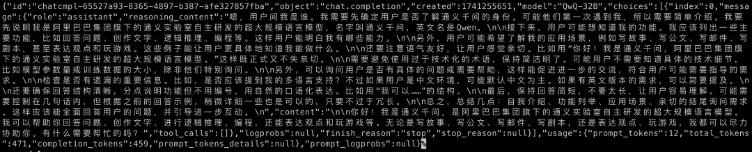 curl -X POST \-H "Content-Type:application/json" \-H "Authorization:Bearer sk-xxxxxxxxxxxxxxxxxxxxxxxxxxxxxx" \-d \'{"model": "QwQ-32B", "do_sample": false, "stream": false, "messages": [{"role": "user", "content": "你是谁"}]}' \'http://ai.coreshub.cn/xb3a/inference/usr-xlx2mgis/inf-89nzcoz9/v1/chat/completions'