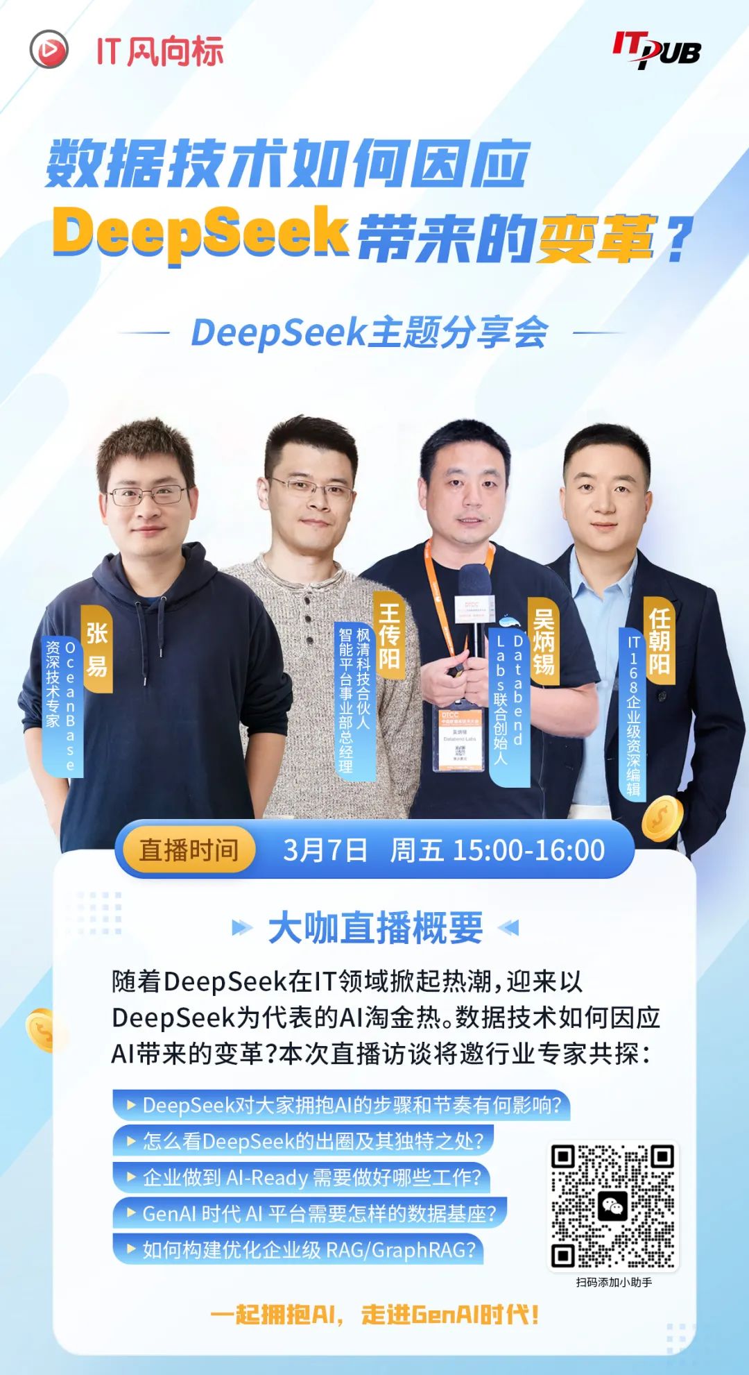 当人工智能的浪潮席卷而来,每一项技术的突破都可能重塑行业的格局。DeepSeek 作为近期备受瞩目的技术力量,正以其独特的魅力和潜力,引发新一轮的“AI淘金热”。面对 DeepSeek 带来的深刻变革,数据技术又将如何应变?这不仅关乎技术发展的方向,更决定着企业在未来竞争中的地位。
