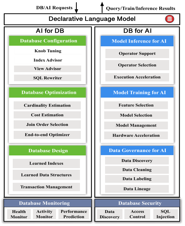 该论文综述了 AI4DB 和 DB4AI 的最新技术。前者侧重于利用人工智能技术解决计算复杂度高的数据处理问题,例如数据库旋钮调整、成本估算、连接顺序选择、索引顾问和视图顾问。后者侧重于使用数据库技术来降低使用人工智能的复杂性和加速人工智能模型,例如,声明式 AI,以及加速 AI 训练和推理。数据库和人工智能都能从对方那里获得各方面的提升,数据库与人工智能结合势必成为未来二者发展的一大趋势。
