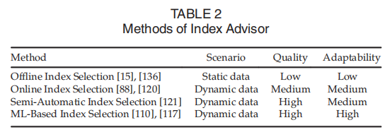 这里存在几个挑战:首先是如何估计 benefit(q, c),一个经典的方法是使用假设索引,它将索引信息添加到 DBMS 的数据字典中,而不是创建实际索引,这样 DBMS 的查询优化器可以识别索引的存在,并在不建立真实索引的情况下估计查询执行的成本。索引的估计 benefit 是有无假设索引时查询执行成本的减少。其次是解决上述优化问题。主要有两种解决方案来应对这些挑战——离线索引选择和在线索引选择(见表2)。离线索引选择方法要求 DBA 提供代表性的工作负载,并通过分析此工作负载来选择索引方案。在线索引选择方法监控 DBMS,并根据工作负载的变化选择合适的索引方案。离线方法和在线方法之间的主要区别在于,离线方法只选择和实现索引计划,而在线方法根据工作负载的变化动态创建或删除一些索引。