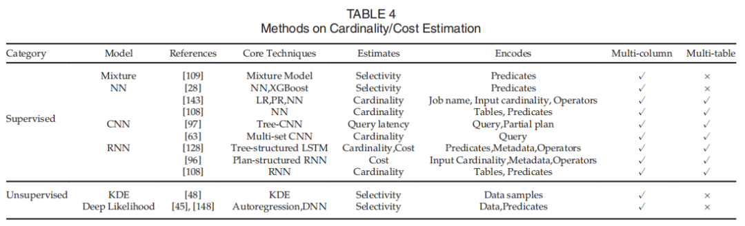 最近,数据库研究人员提出使用深度学习技术来估计基数和成本。基于学习的基数估计可以分为有监督方法和无监督方法,相关方法分类详见表4。有监督方法:可以根据它们所采用的模型将监督方法进一步分为以下类别。